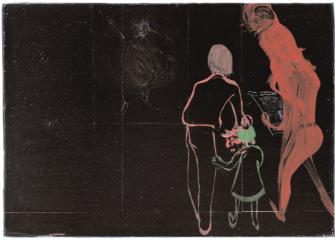 Liebe ist ein abstraktes Bild aus aufgeklebtem, Falten schlagendem golddurchwirktem Papier, abstrakt auch Das neue Leben, horizonale malerische Streifen in Grün, und Ewigkeit. Verstörend Makabres dazwischen: ein zerstückelter und gepfählter Kinderkörper im Schoß eines Jungen, drastisch neben der collagierten Abbildung einer effizienten Arbeitswelt. Die Verletzlichkeit des menschlichen Körpers in der Phantasie nach vorne abgewinkelter Unterschenkel, die das Skelett entblössen, eine fragile Gestalt bodenlos, ohne Halt. Glück und Armut: beinahe ironisch zwei kauernde Gestalten, die eine stülpt der anderen einen Eimer über den Kopf, ein schlacksig rotlangbeiniges Mädchen passiert – und er will alles sehen... Ein Eltenpaar, dazwischen das Kind: die biedere Rückenansicht der Mutter, der Vater, die Zeitung lesend, mit Rattengesicht ein Intellectus moribundus, nur das Kind erkennt die Christusgestalt in Gold und Blau mit Lichterkranz, die Male an Händen und Füßen tragend.