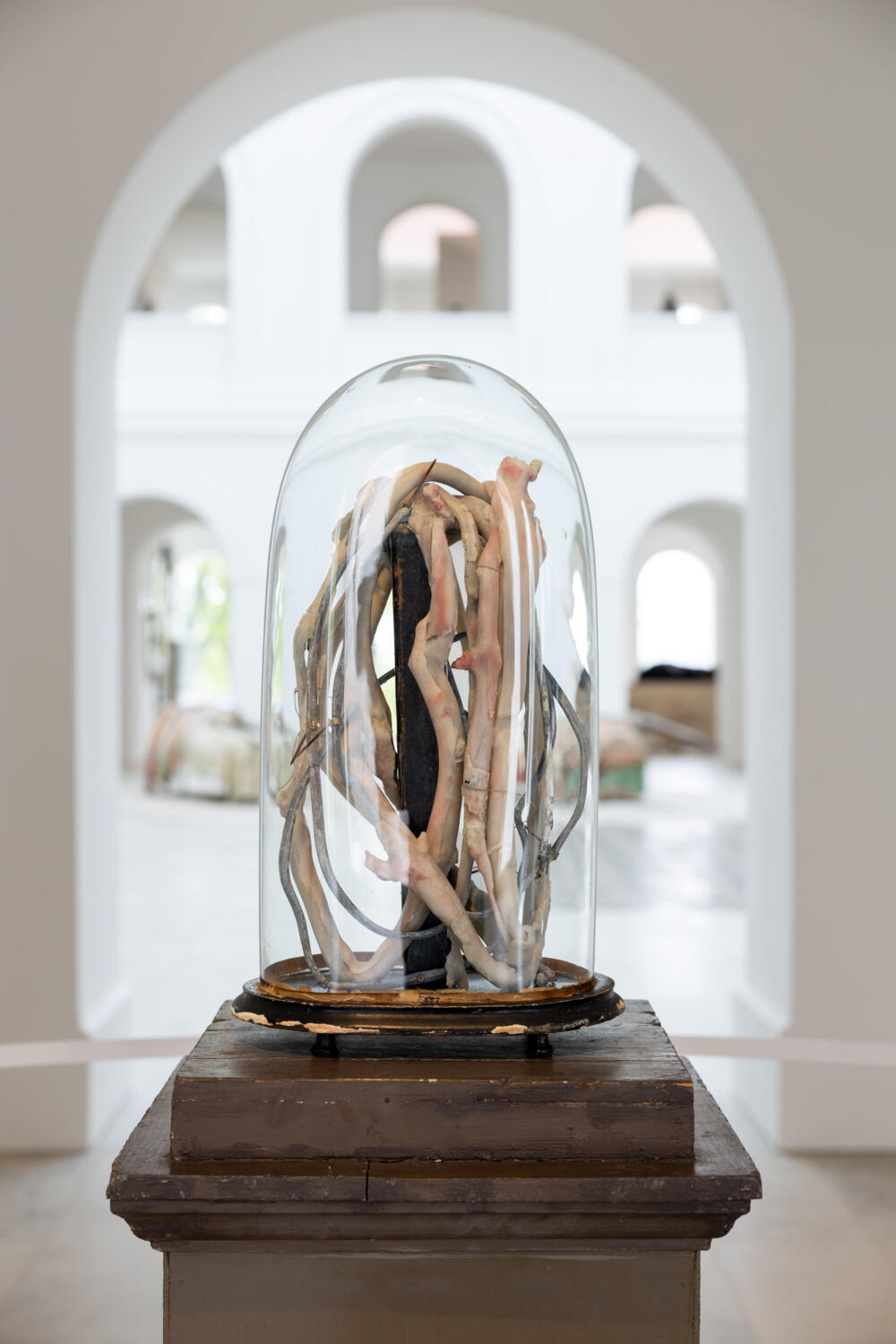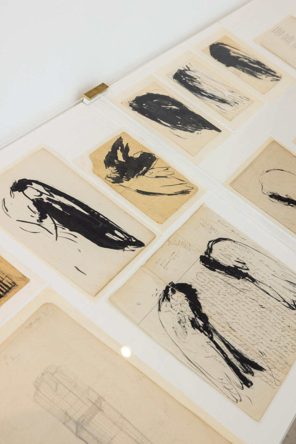 In the Münchner Saal, the focus remains solely on the motif of the angel. The central piece, Liggende – Arcangelo III, 2023, was created especially for the exhibition. The collapsed angel fallen face down on a pedestal made of debris, is accompanied by a selection of very early works and sketches here shown for the first time, investigating the angel/the wing in Berlinde De Bruyckere’s oeuvre.